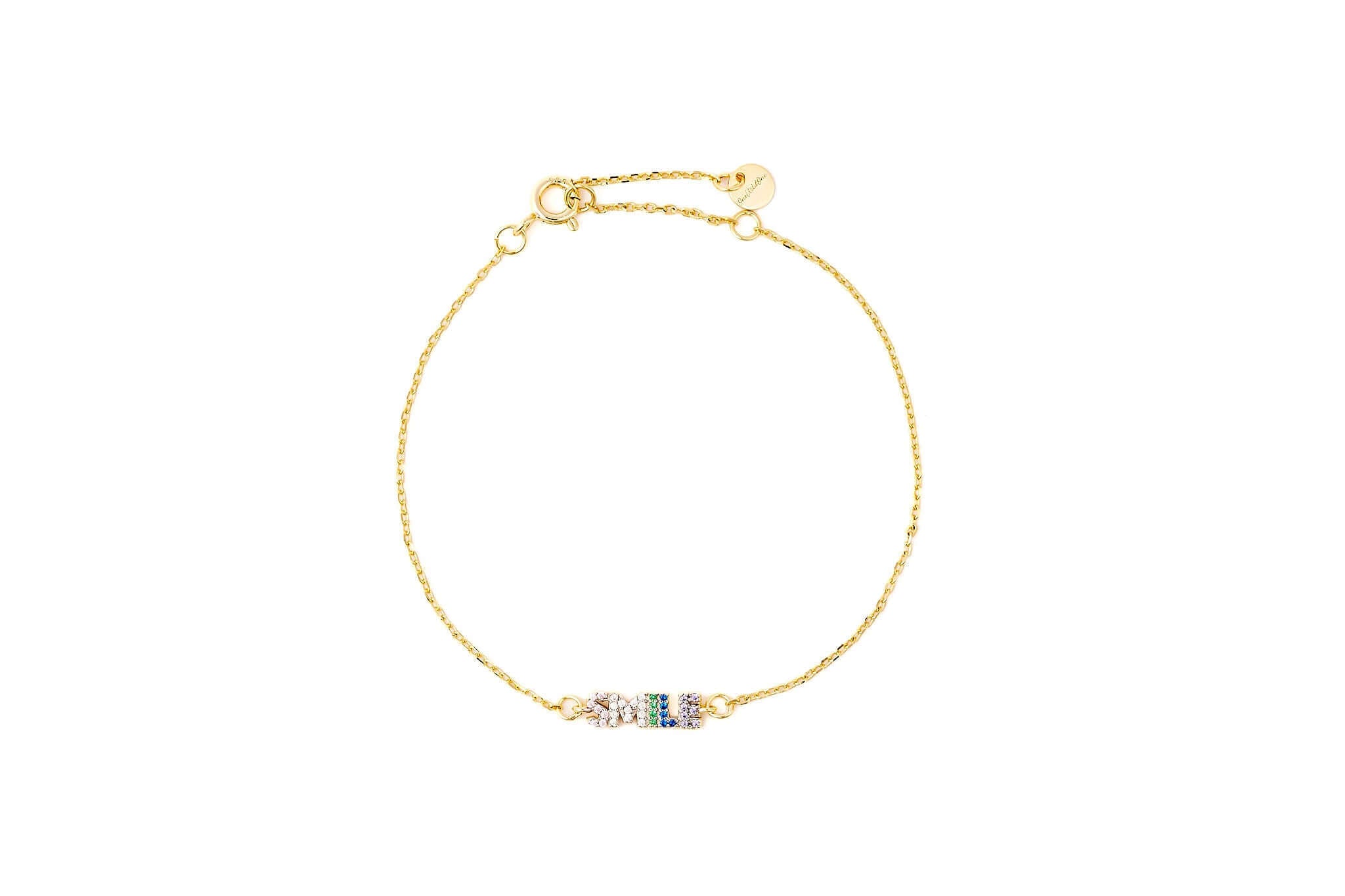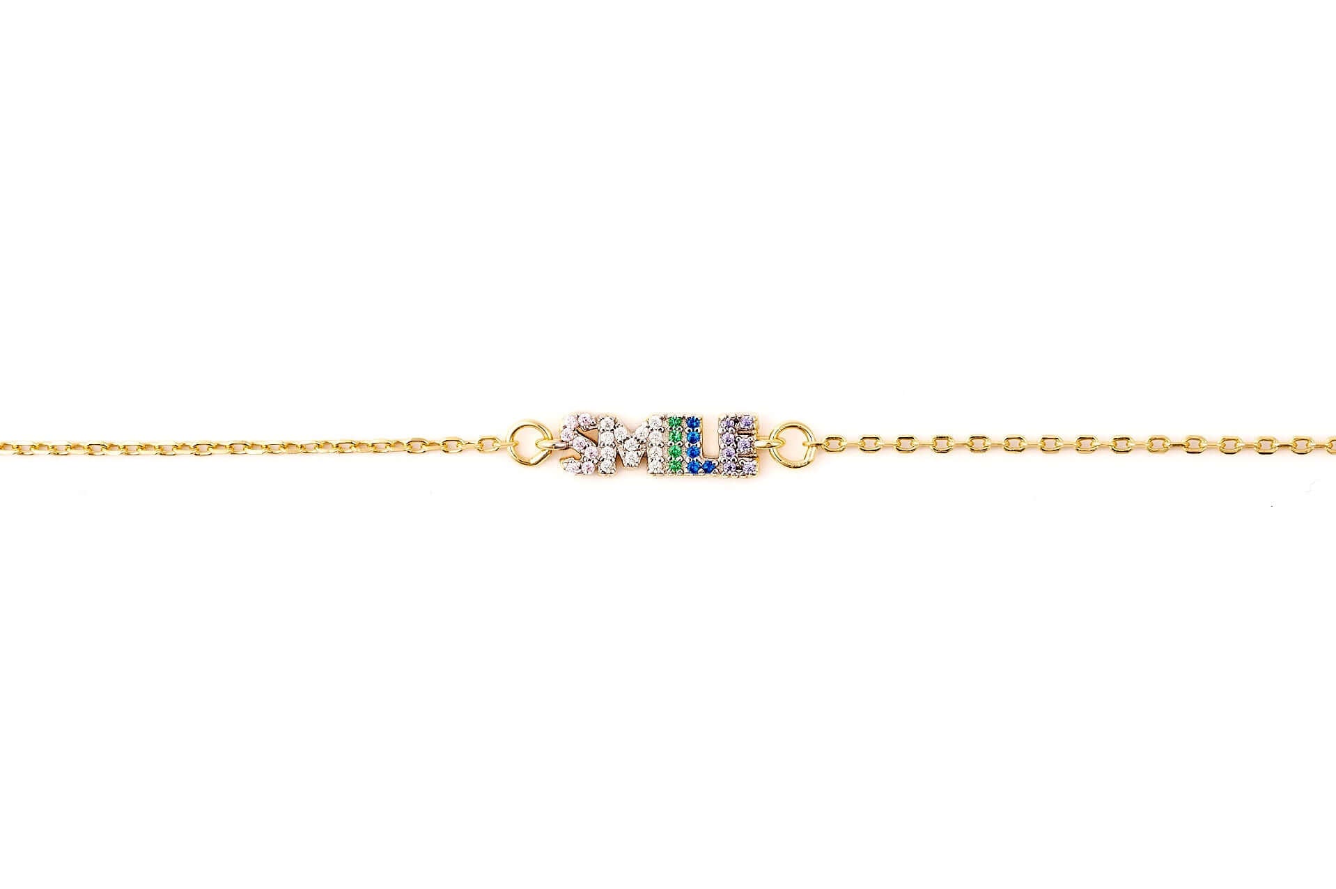 Crafted from 925 sterling silver and finished with 14k gold plating, the "Don't Forget To Smile Today" bracelet features a delicate rainbow CZ 'smile' design. Its adjustable chain ensures a perfect fit, combining elegance with comfort.