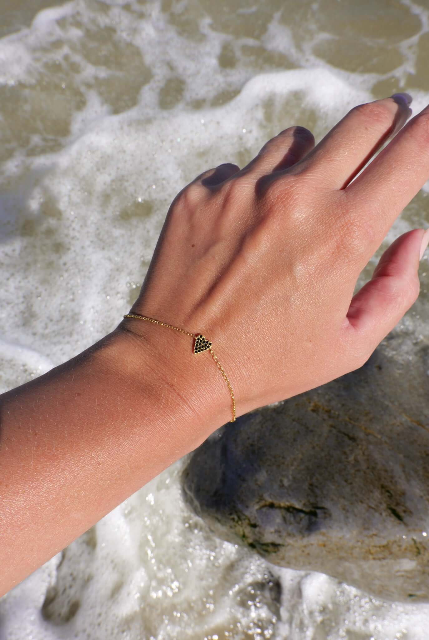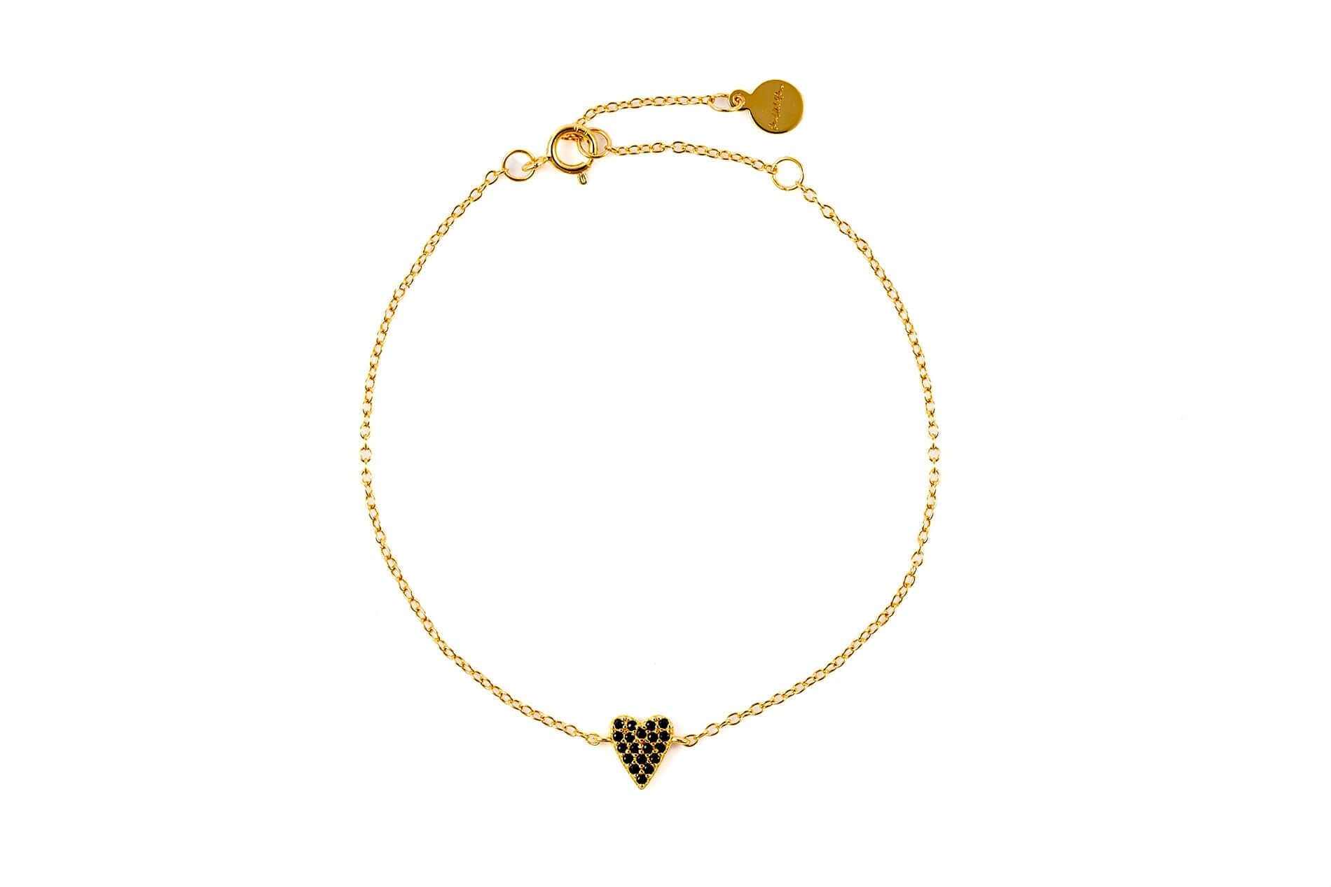 Crafted from high-quality 925 sterling silver and enhanced with a 14k gold plating, the She's So Lucky Black Heart Bracelet features a striking black CZ heart pendant. Designed with an adjustable chain and secure lobster clasp, this bracelet offers a comfortable fit for any wrist size, combining elegance with practicality for lasting wear.