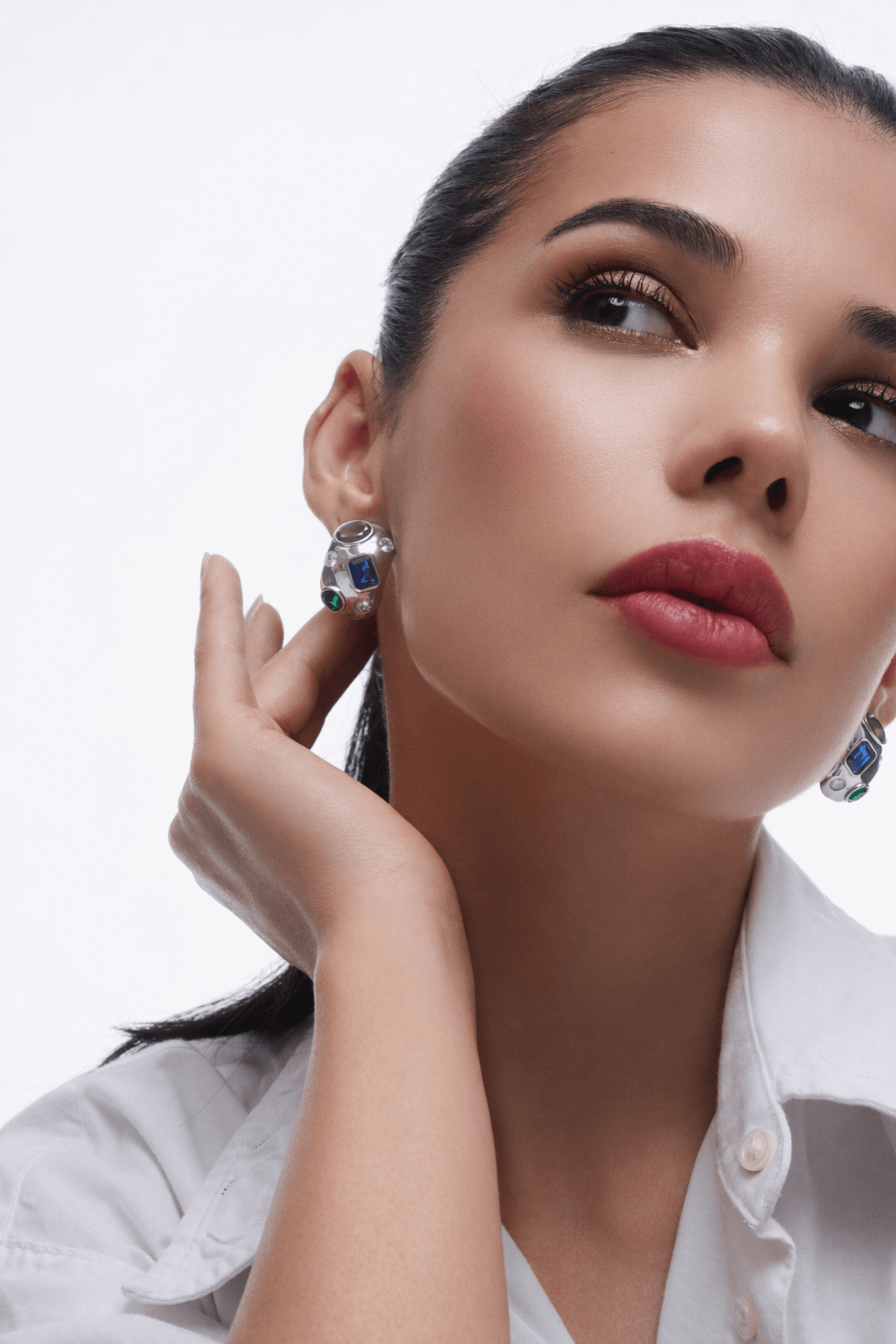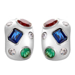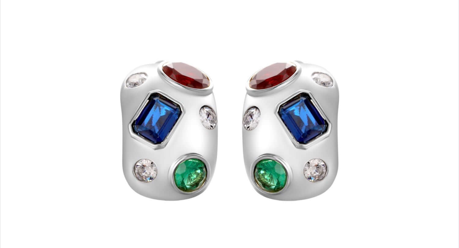 The Apricity colourful gem chunky silver earrings are a bold yet refined statement, designed in a chunky huggie silhouette and set with vibrant, multicolour gemstones for a striking pop of colour. Smooth, polished silver tones contrast beautifully with rich red, deep blue, green and clear stones, creating a modern yet timeless finish.