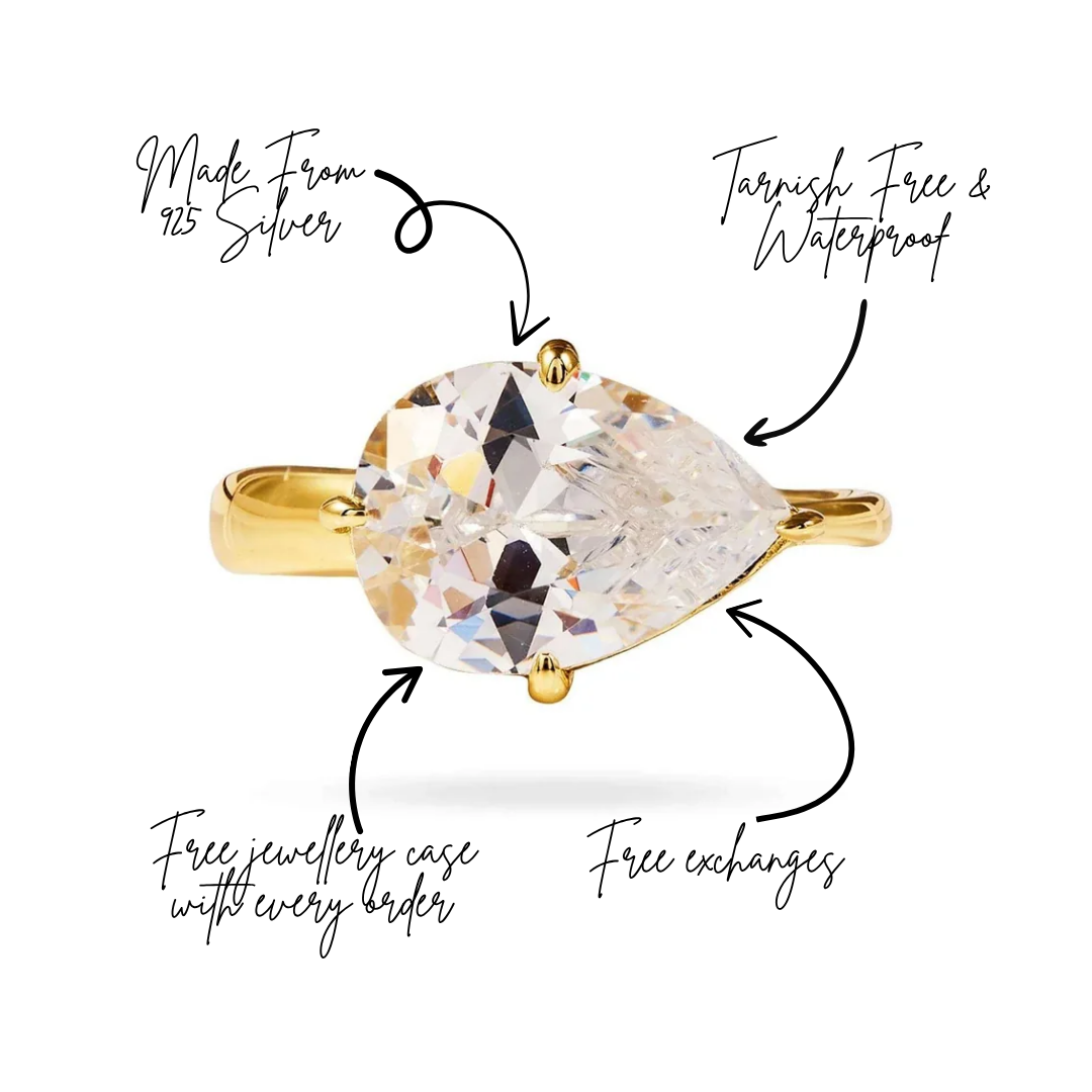 The Hopeless Romantic Society East-West Pear Gold Ring features a unique East-West pear cut, crafted from 925 sterling silver and delicately plated with 14k gold.