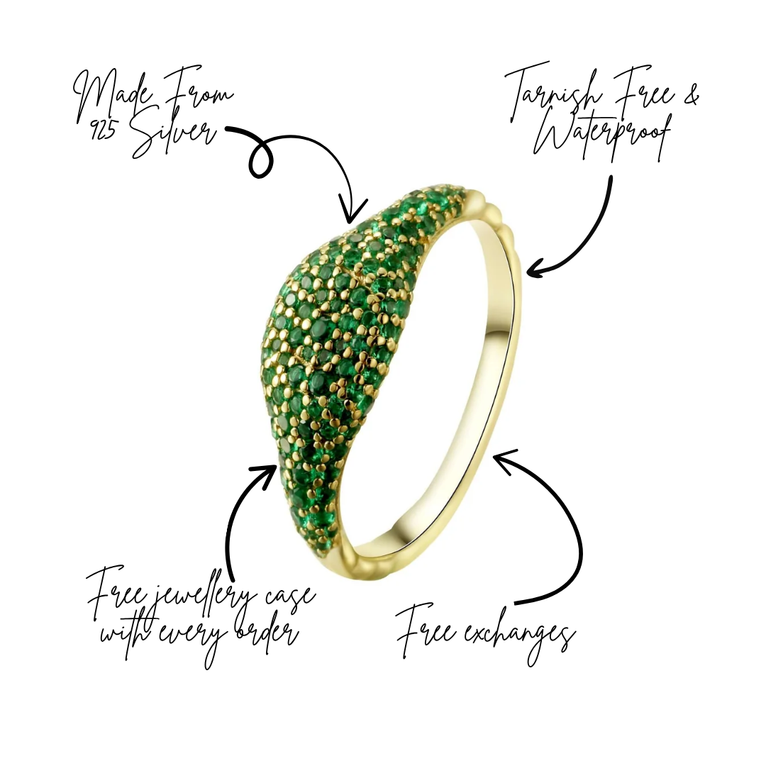 Delicately bold, this Showgirl Pavé Gold Ring is crafted in 925 sterling silver and 14kt yellow gold plating and illuminated with emerald coloured pavé-set cubic zirconia. Its sculptural silhouette offers a refined balance of elegance and modern edge – perfect for adding a touch of vibrant sophistication to any look.