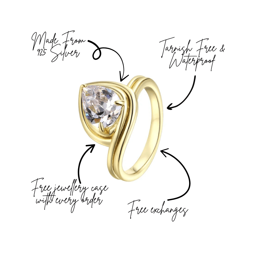 This chunky tilted pear solitaire ring combines bold design with a unique edge. Made from 925 sterling silver and finished with 14k gold plating. Waterproof and tarnish proof.